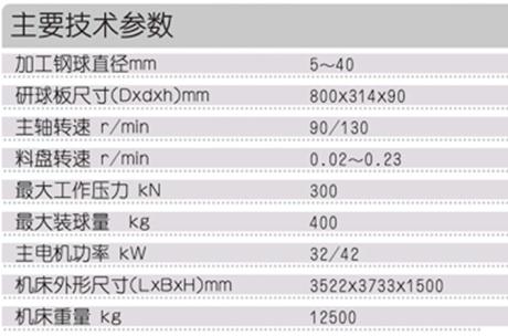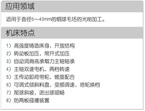 本機(jī)床采用臥式布局和循環(huán)加工方式。主機(jī)床身重約5000kg,內(nèi)部加強(qiáng)筋布局合理,以提高強(qiáng)度,機(jī)床耐沖擊性和抗變形能力增強(qiáng)。主機(jī)與主傳動(dòng)分離,料盤(pán)采用傾斜方式,料盤(pán)的旋轉(zhuǎn)采用交流變頻調(diào)速。進(jìn)球口處增加爬球坡道,直接從料盤(pán)切線(xiàn)處進(jìn)球。加壓方式采用液壓驅(qū)動(dòng),蓄能器保壓裝置。通過(guò)改變雙速電機(jī)的極數(shù)可得到主軸兩檔轉(zhuǎn)速。
